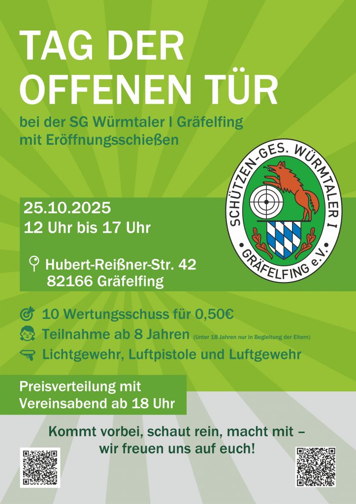 Am 25. Oktober 2025 laden die SG Würmtaler I Gräfelfing herzlich zum Tag der offenen Tür ein. Von 12 bis 17 Uhr habt ihr die Gelegenheit, einen Einblick in unseren Verein zu bekommen.